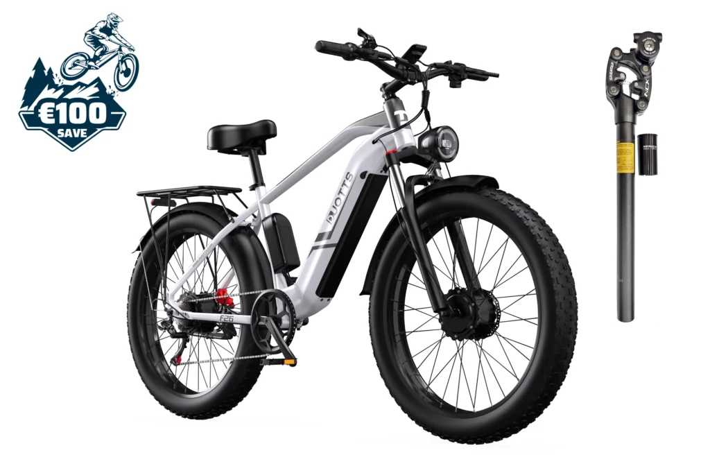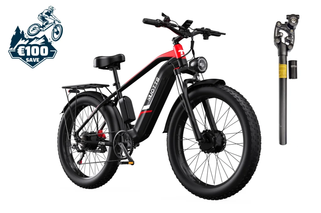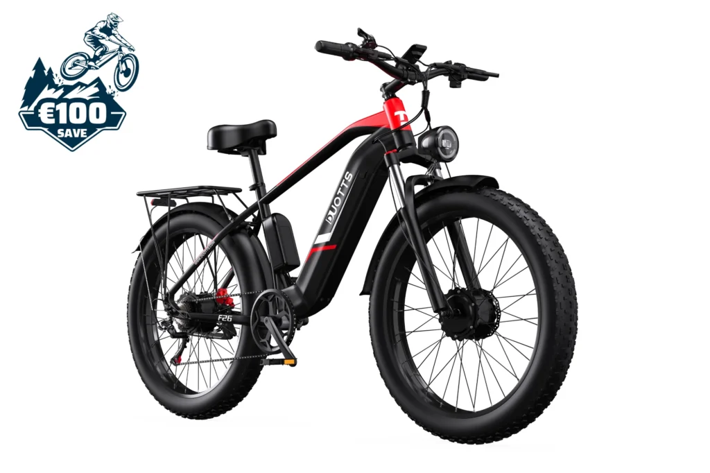 Explore the DUOTTS F26 – a powerful electric bike with dual 750W motors, 48V 20Ah battery, and 26″ fat tires. Ideal for all terrains. Order now from the official store.