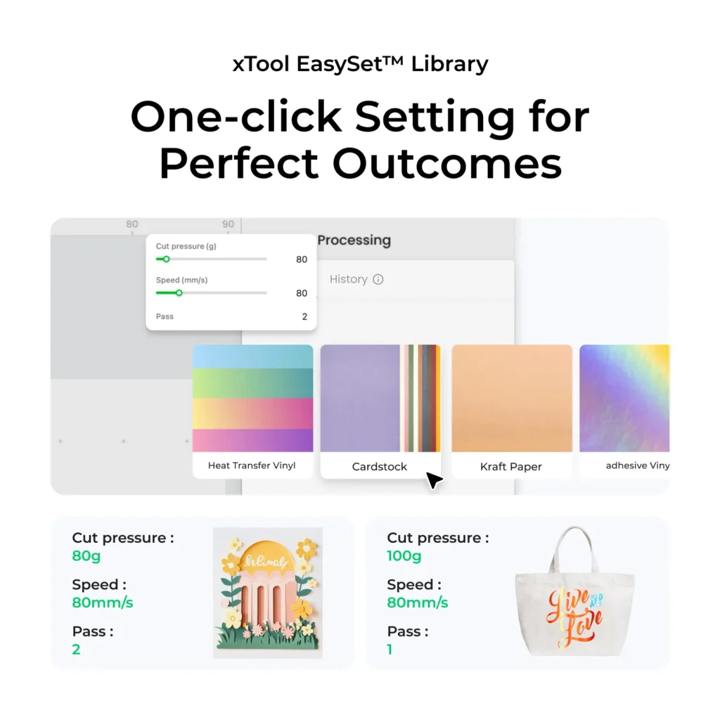 | Multiple Material Compatibility | Works well with paper up to 300 gsm, various vinyls (heat or adhesive), printable materials, and foil transfer sheets. Acrylic with protective paper is also supported. |