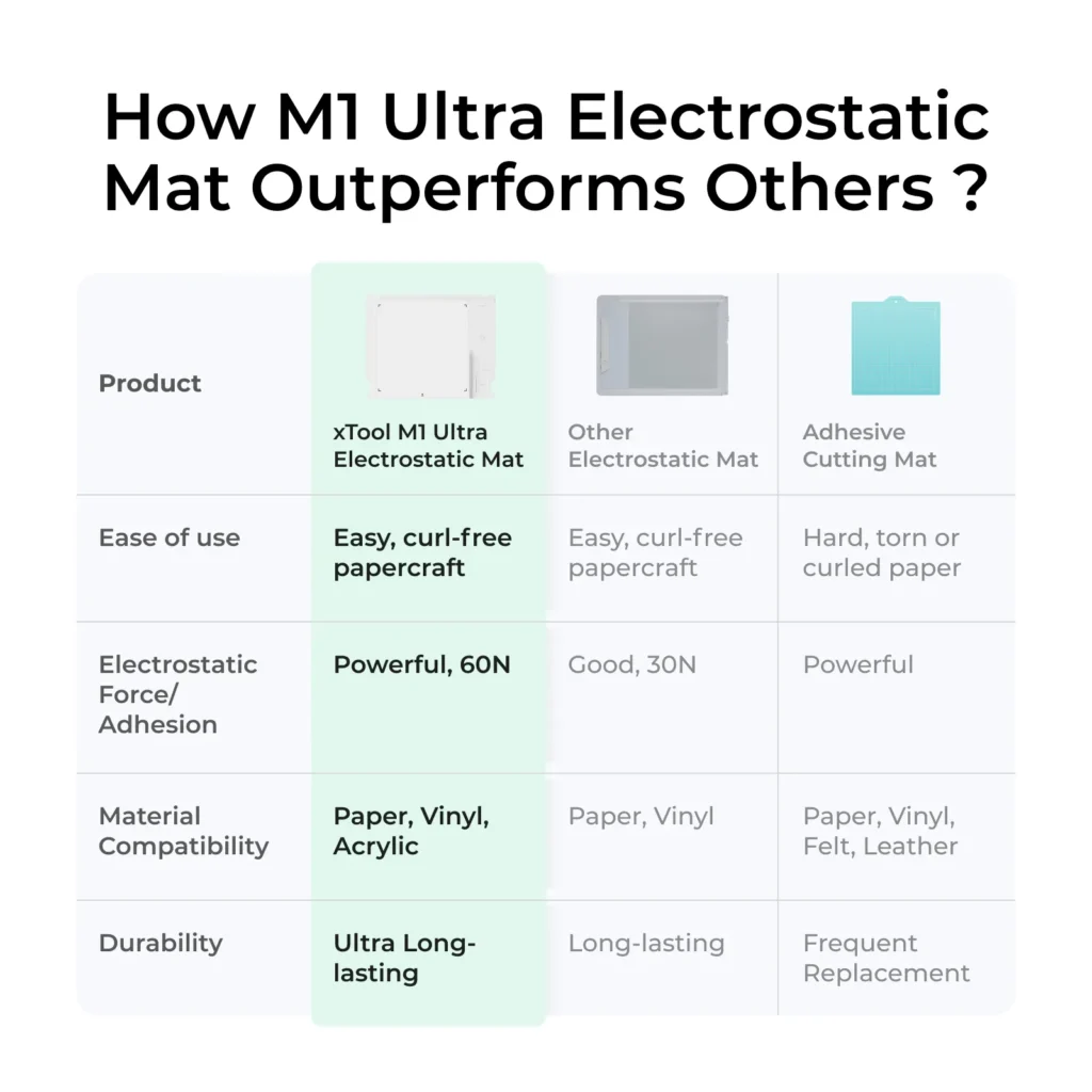 The xTool Electrostatic Mat is a smart upgrade for anyone using the M1 Ultra and wanting cleaner, more efficient crafting. It delivers strong holding power, reduced mess, and much less material waste. For paper, vinyl, foil, and similar materials, this mat makes the process smoother. If you want your cut/print projects to look professional without the hassle of sticky mats, curling, or cleanup, this is one of xTool’s best accessories.