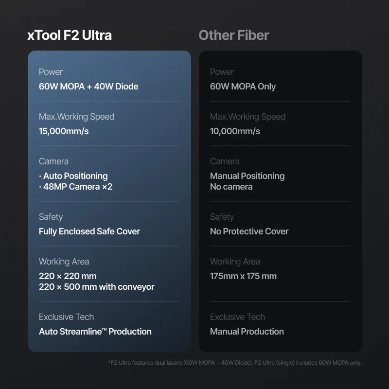 | xTool F2 Ultra (Dual) | 60W MOPA Fiber + 40W Diode | Engraves metals (color & deep) + cuts thick wood, acrylic, leather |