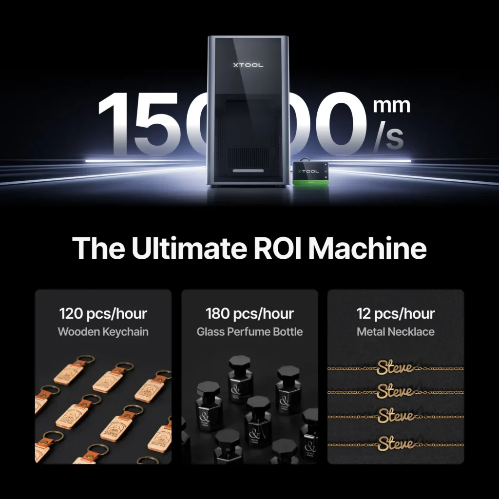 | xTool F2 Ultra (Dual) | 15,000 mm/s | 220 × 220 mm (expandable 220 × 500) | Conveyor system for mass production |